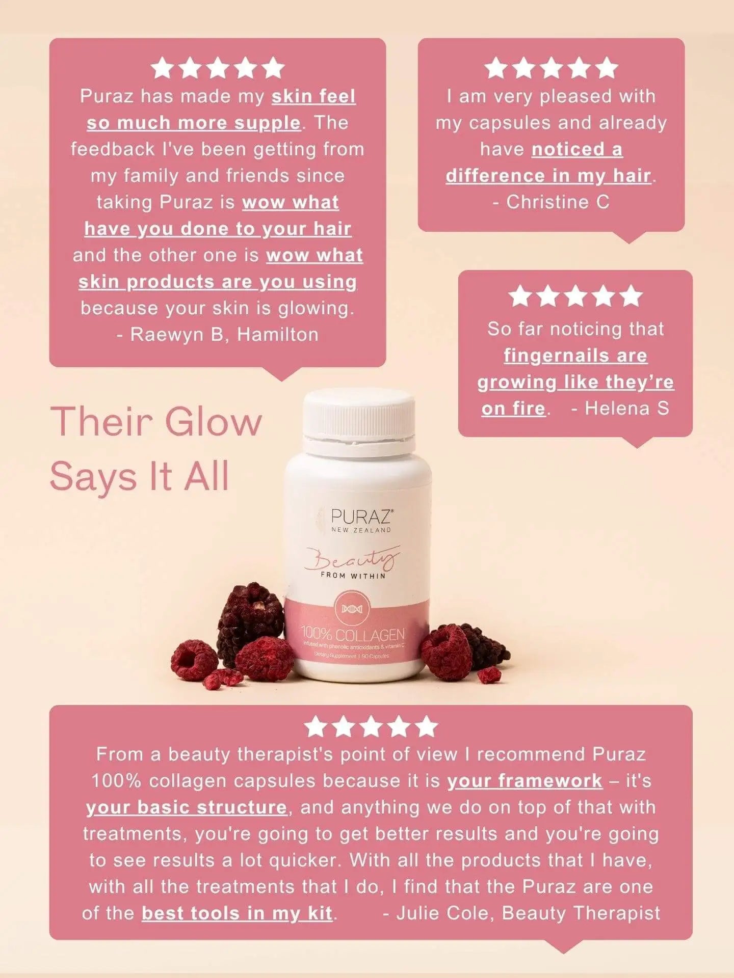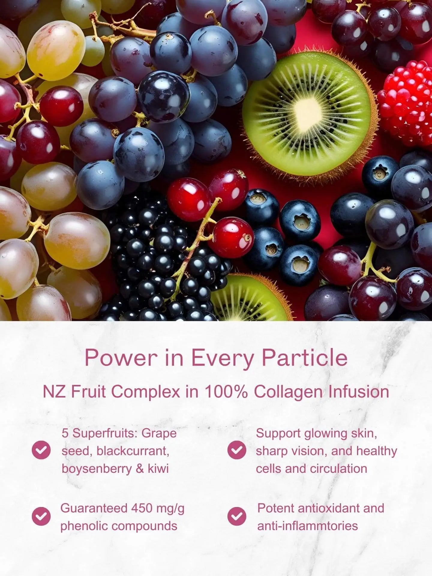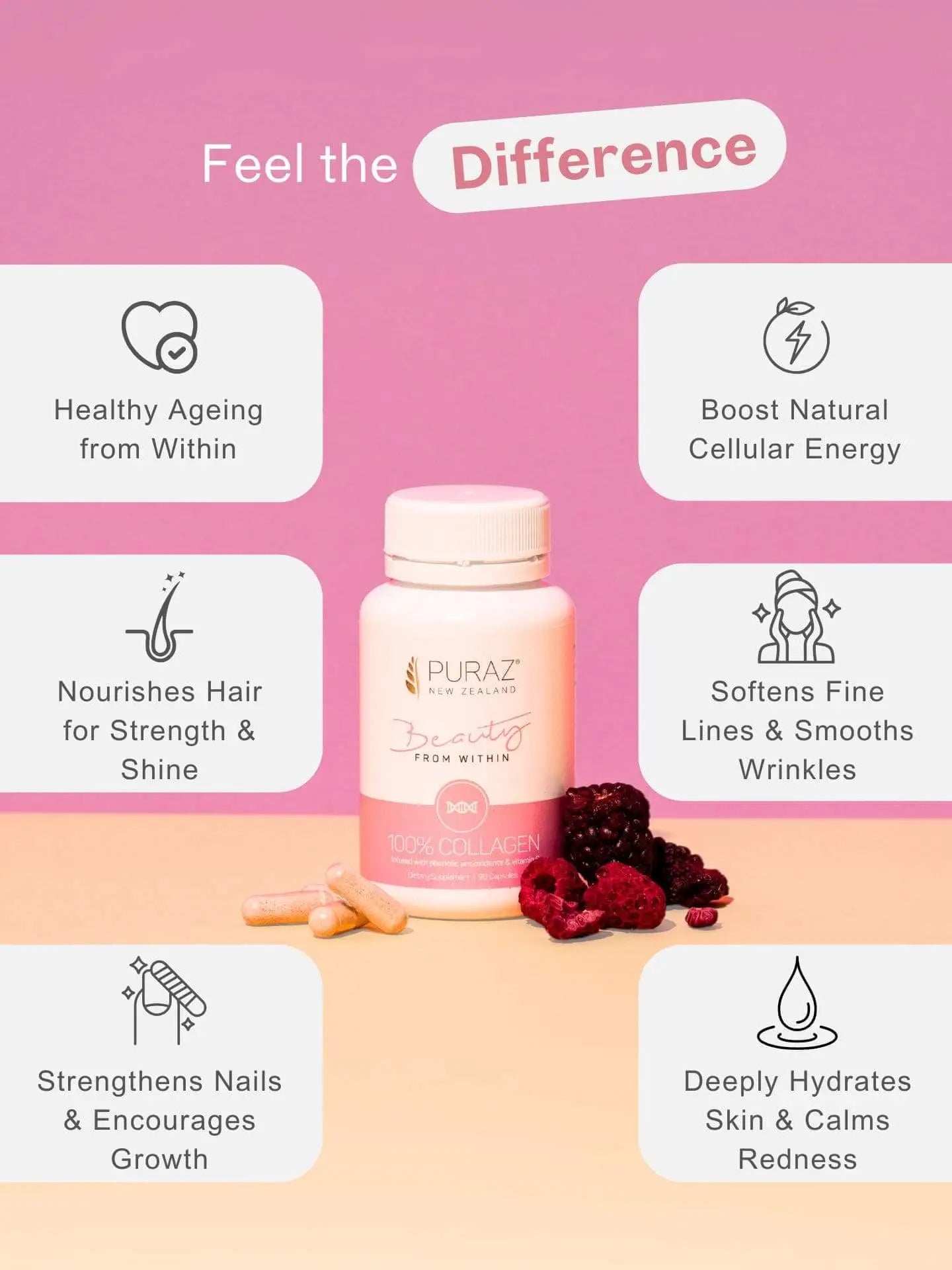 Puraz Collagen Infusion Capsules is infused with New Zealand phenolic antioxidants from grapes, boysenberries, blackcurrants, and kiwifruit, providing support against free radicals that cause skin damage and ageing. NZ-grown fruit has higher antioxidant levels due to strong UV exposure and low pollution.
