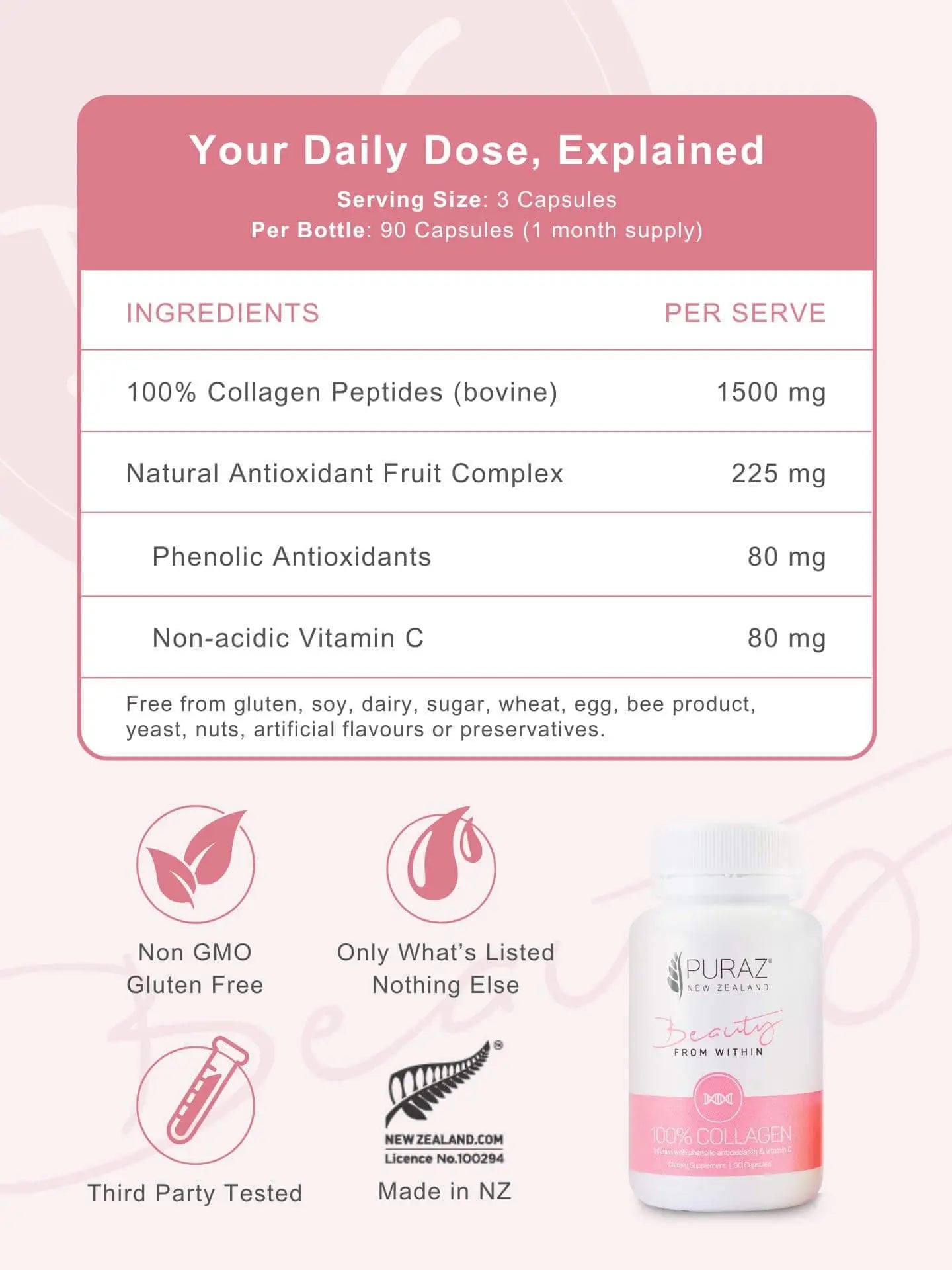 Packed with phenolic antioxidants from New Zealand’s super fruits, it protects against free radicals and oxidative stress. With added vitamin C for collagen synthesis, Puraz Collagen Infusion Capsules ensure healthy skin, hair, and nails.