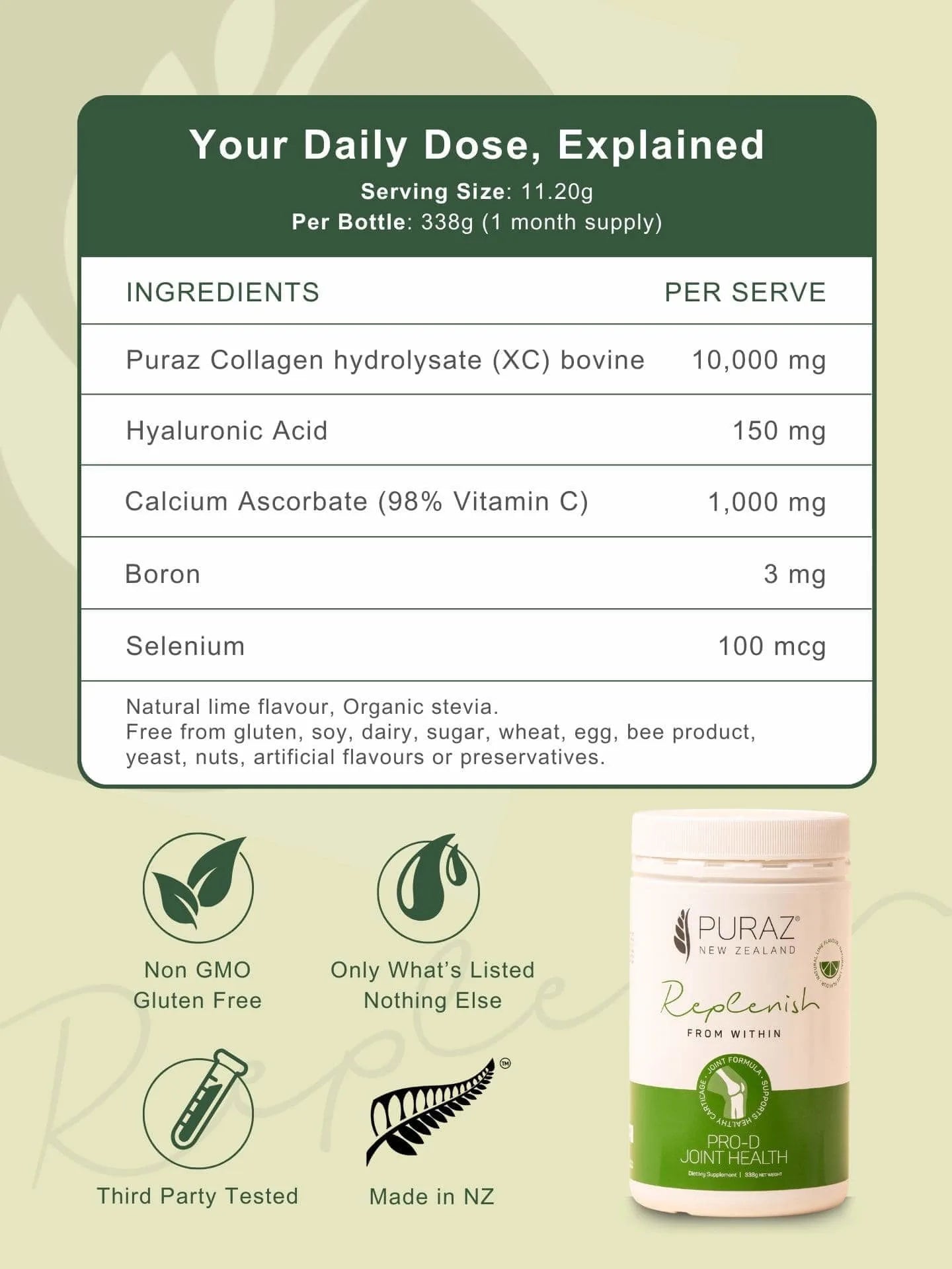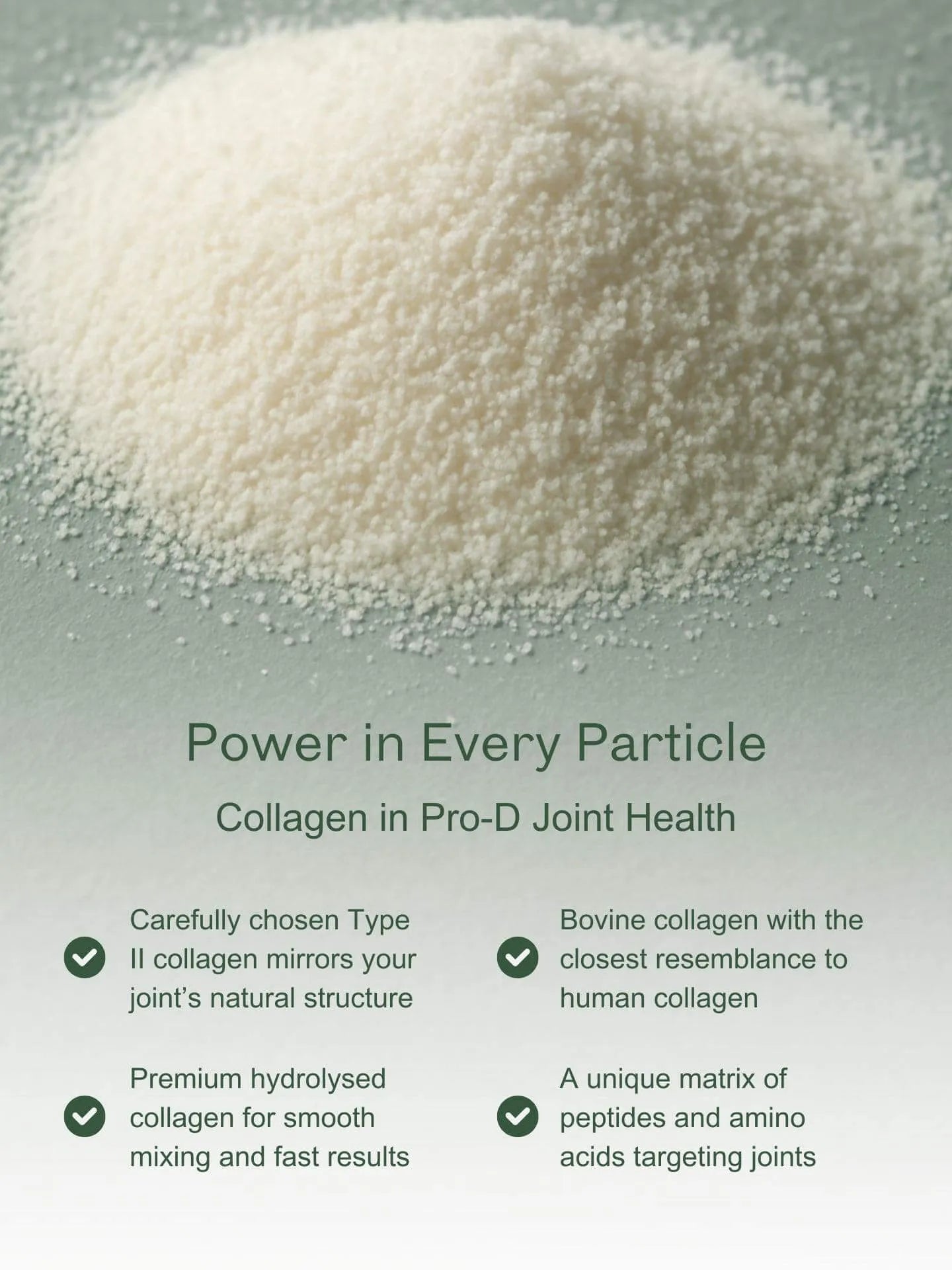 Unlock superior joint support and experience enhanced mobility with PRO-D. This advanced formula harnesses the power of scientifically researched natural ingredients, including collagen hydrolysate and hyaluronic acid, to provide your body with the optimal nourishment it needs.