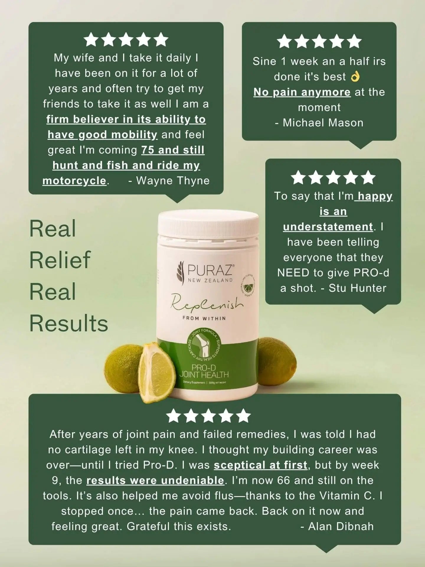 Results may vary, however consistent use of PRO-D over time, along with a healthy lifestyle, can lead to noticeable improvements in joint comfort, flexibility, and mobility. Results can often be observed within weeks of regular usage! See our reviews for more information on how PRO-D has helped our customers.