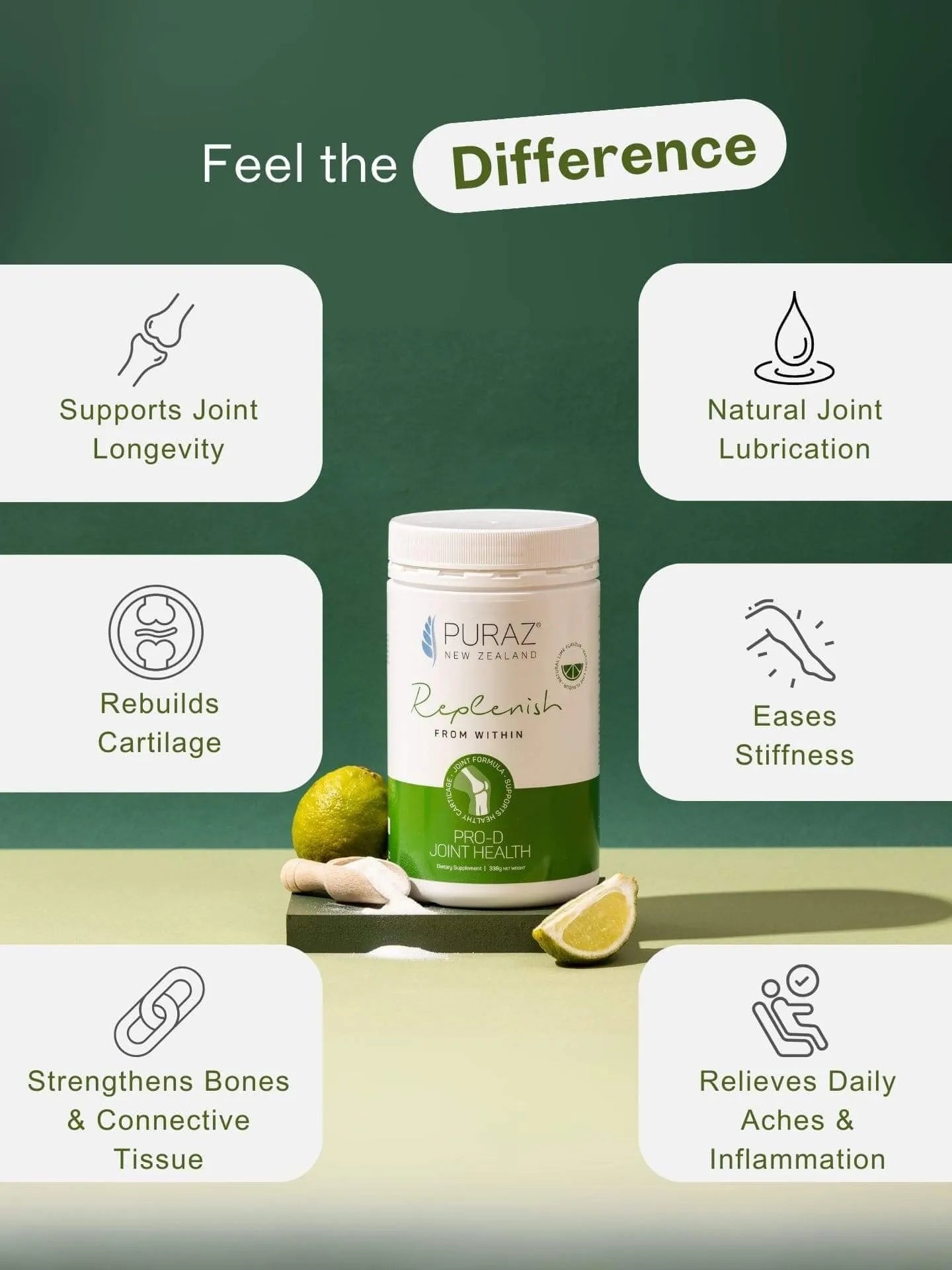 PRO-D supports healthy cartilage and promotes joint flexibility, allowing you to move freely and comfortably at any age.