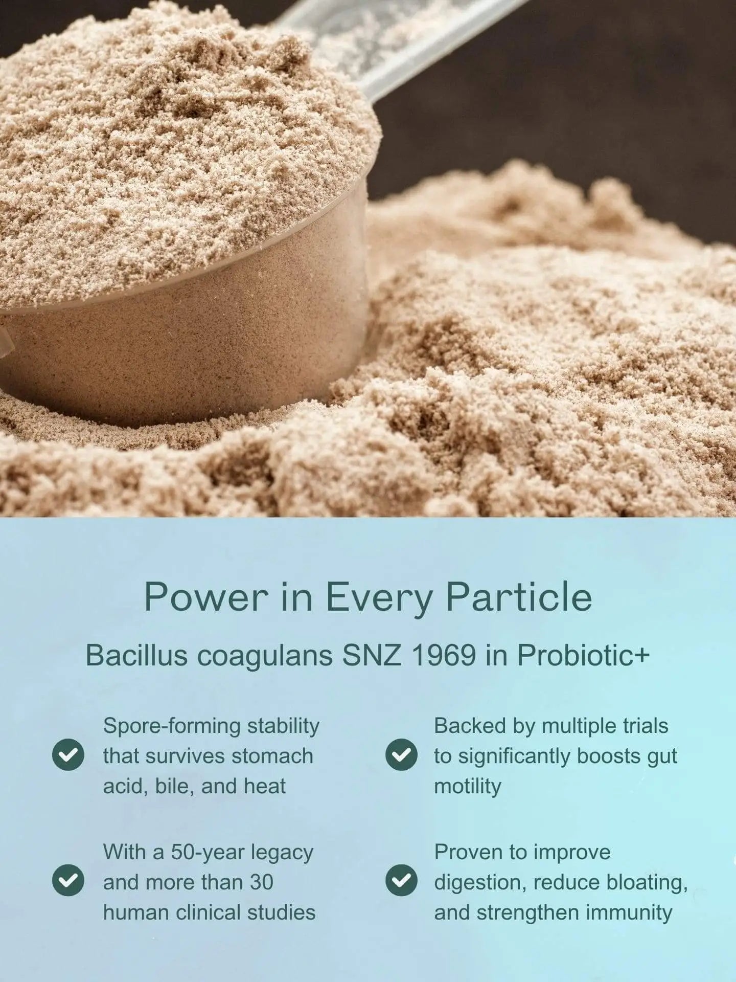 Probiotic+ contains a mix of regular vegetative bacteria and the spore-former b. coagulans. For cost reasons most probiotics contain one or the other and in lower doses. We are not aware of another collagen probiotic that contains both types of probiotic and that delivers 30 billion live bacteria. B. coagulans is acid, bile and heat stable and exists in a spore state within the product, while the other bacteria are in a stabilised vegetative state. Probiotic+ contains Livaux which is a natural prebiotic made from NZ grown gold kiwifruit. We do not use cheap, imported polysaccharides (such as inulin) as prebiotics.