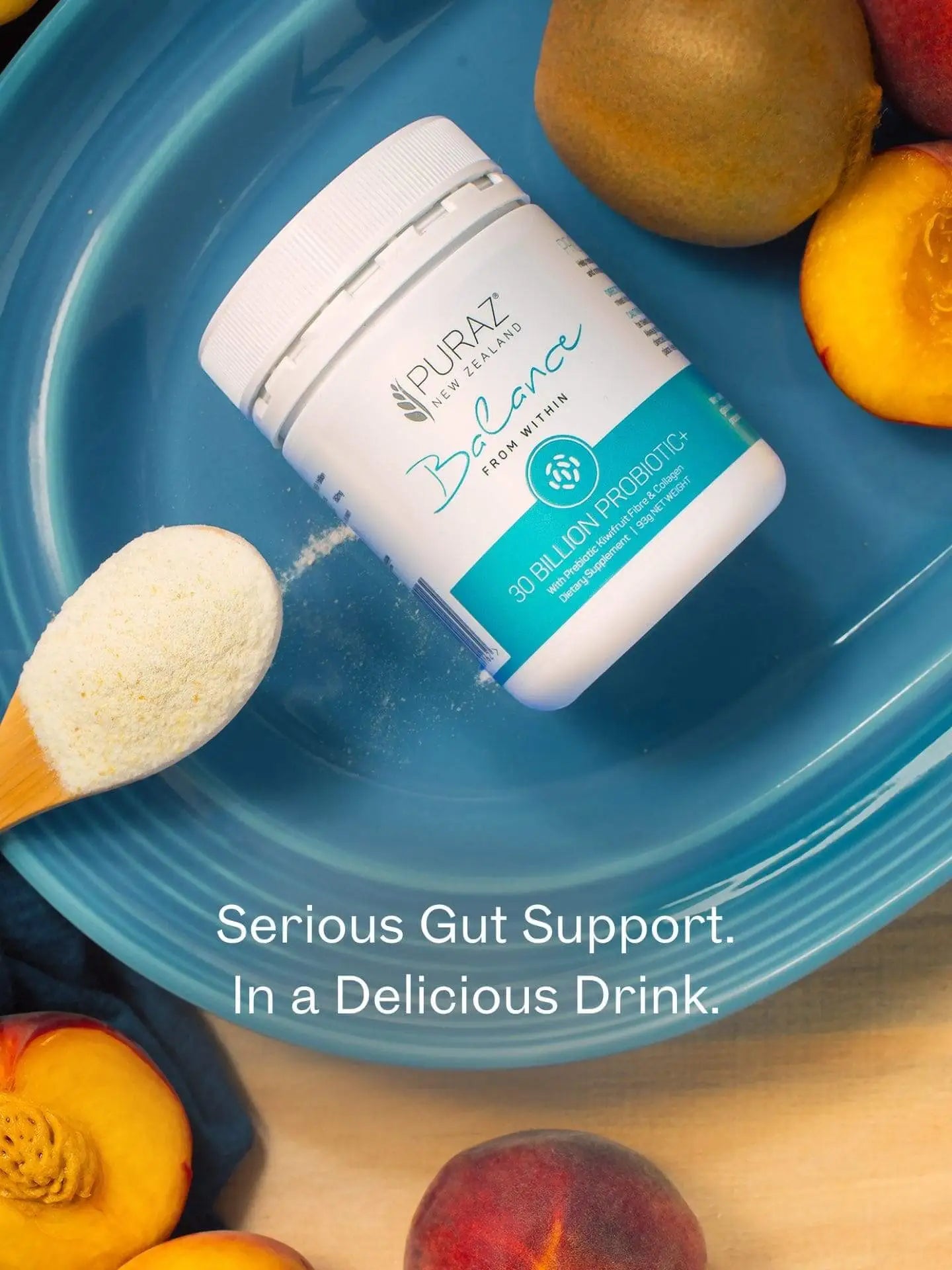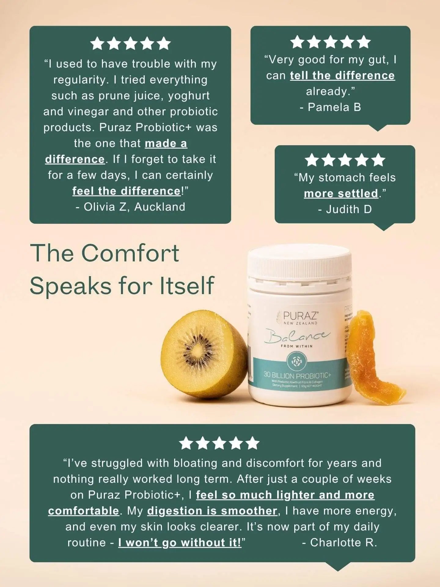 With our unique blend of collagen, powerful probiotics and the renowned NZ gold kiwifruit prebiotic, Livaux®, Puraz Probiotic+ offers your gut the soothing comfort and support it deserves. Prepare to elevate your well-being to new heights and embrace a healthier, happier version of you!