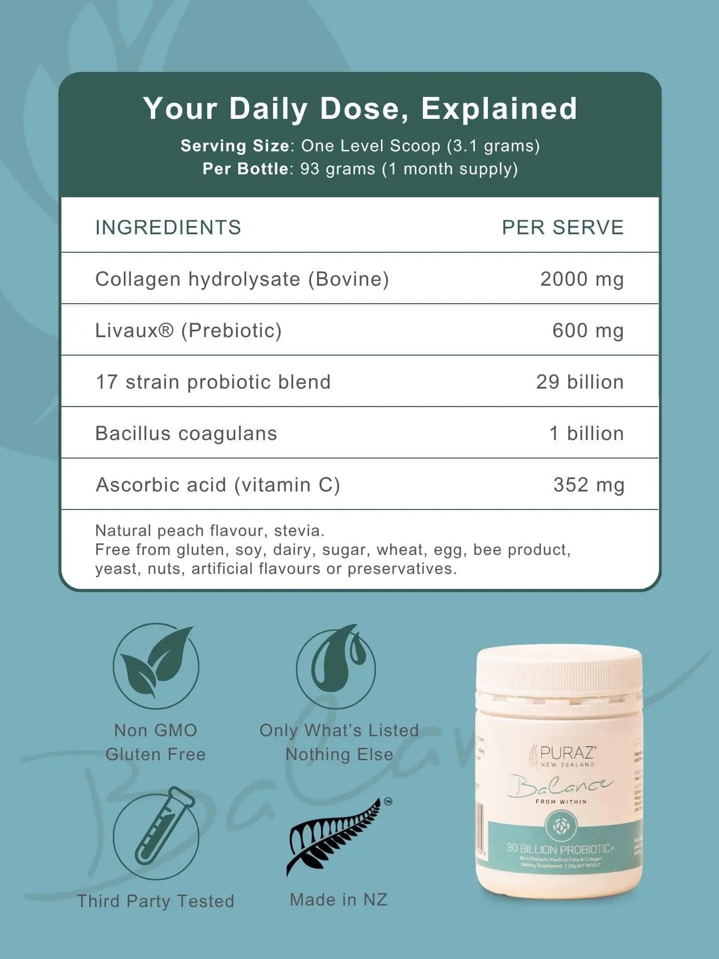 Collagen is included in Puraz Probiotic+ because it serves an important role in supporting the health and integrity of connective tissues throughout the digestive tract. As we age, our body’s natural collagen production decreases, which can impact the strength and elasticity of our gut lining. By incorporating hydrolysed collagen peptides into the formula, Puraz Probiotic+ provides essential amino acids that support the maintenance and repair of gut tissues. This helps to promote a healthy gut barrier function and supports overall digestive health. In addition to its benefits for the gut, collagen also plays a role in supporting immune function and tissue regeneration throughout the body. Including collagen in Puraz Probiotic+ ensures that you not only nourish your gut microbiome but also provide vital support to the tissues that line your digestive tract.
