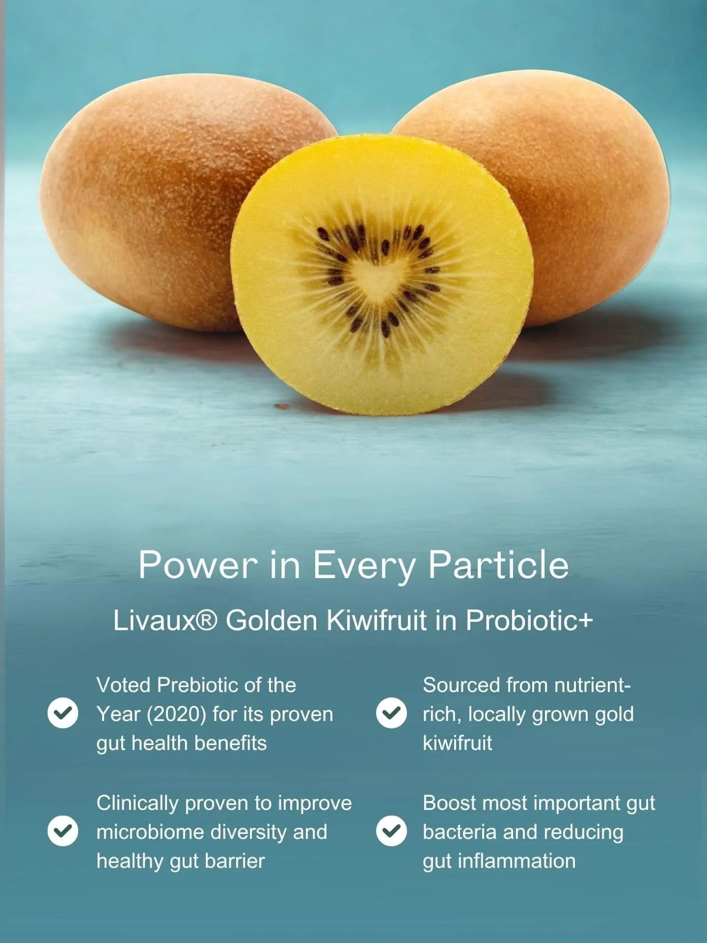 Livaux® is the prebiotic component of our gut supplement a natural ingredient derived entirely from non-GMO New Zealand gold kiwifruit. Livaux® restores F.prau (Faecalibacterium prausnitzii) which is an intestinal bacteria for microbiome balance.