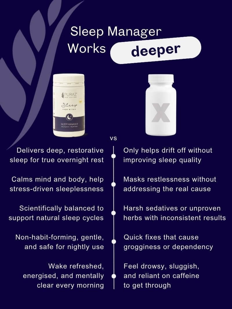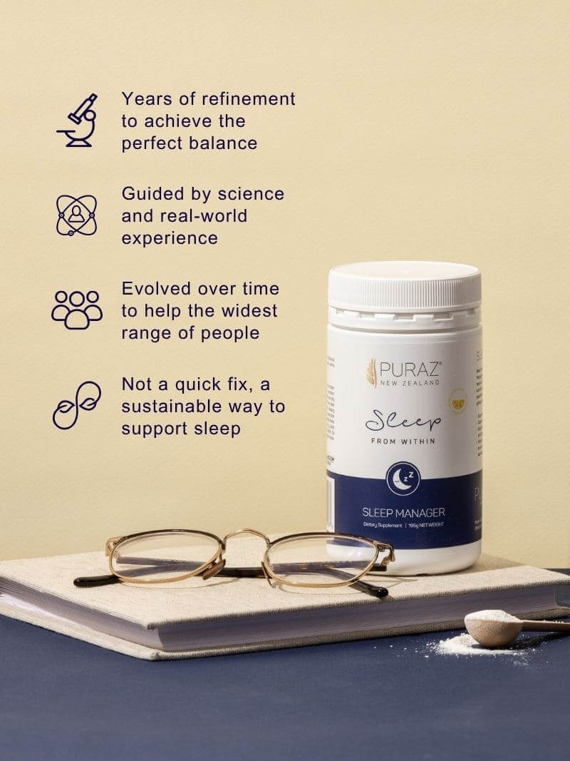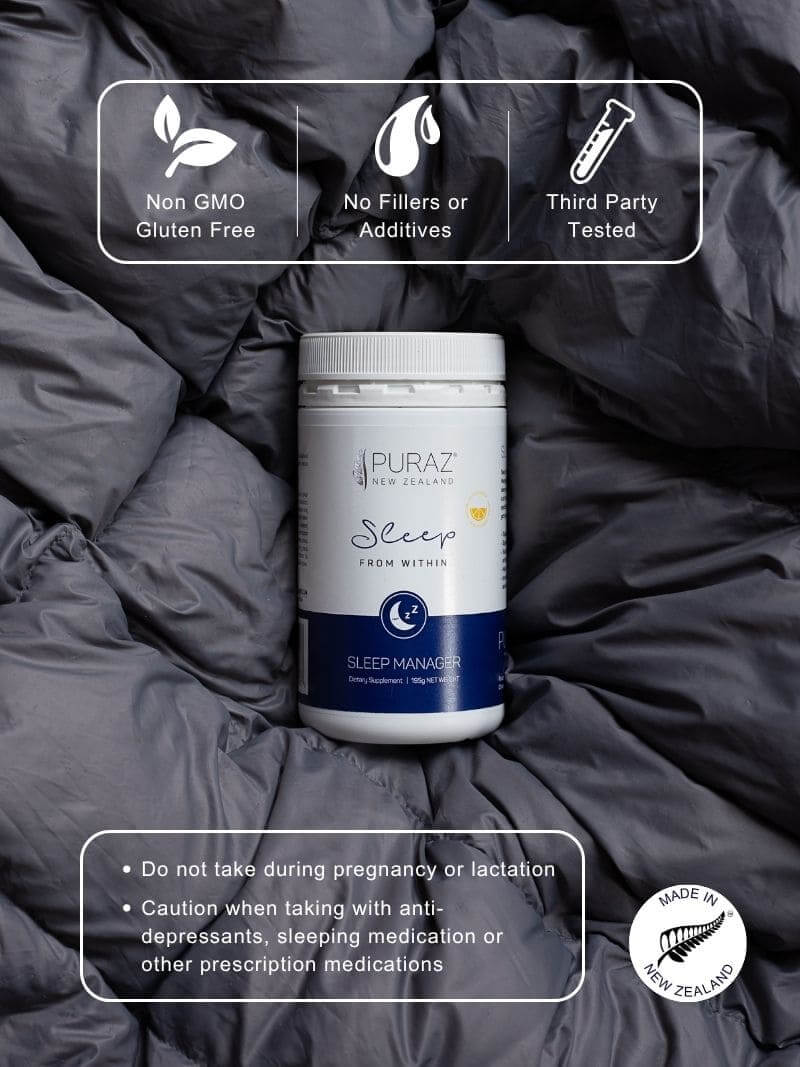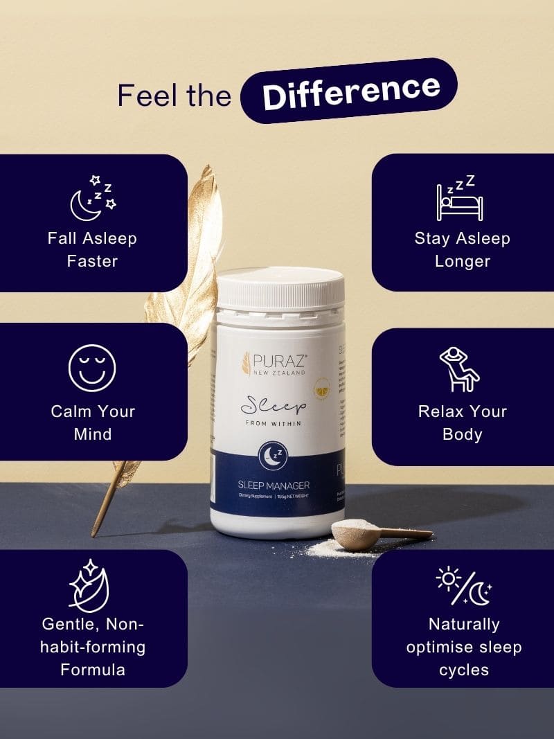 Don’t compromise on sleep quality any longer. Puraz Sleep Manager is your solution for a truly restorative sleep experience. Wake up feeling refreshed, energised, and ready to take on the day with this advanced sleep support supplement. Say goodbye to sleepless nights and embrace the benefits of a good night’s sleep with Puraz Sleep Manager.