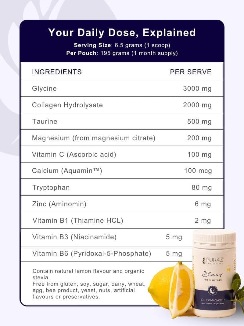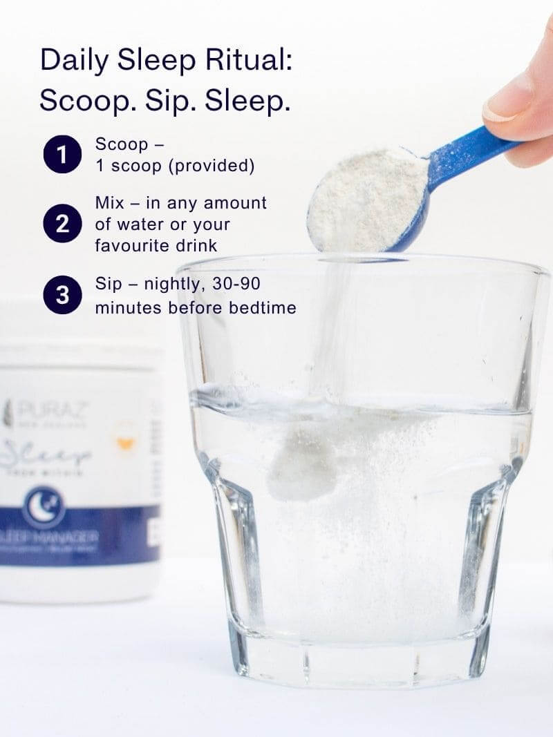 Directions: Sleep Manager is easy and convenient to take, simply use the provided scoop for the recommended daily dose, and mix into a glass of water. The refreshing natural lemon flavour adds a pleasant taste to the supplement.